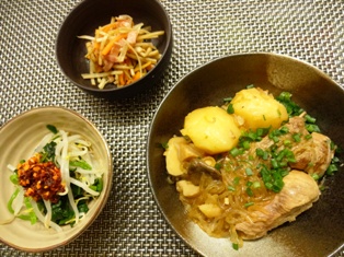 鶏肉の韓国風鍋(まるごとル・クルーゼより)高野豆腐とセロリの煮物(てんきちてんきち母ちゃん家のふつうの日の絶品ごはんより)ごぼうとにんじんの醤油麹きんぴら(塩麹&麹レシピより) * * * * * * * * * * * * *夫飲み会につき、簡単晩ごはん。一皿でお肉も野菜の取れる鍋風の煮物がメインです。コチュジャンや味噌、醤油などを合わせたたれに鶏肉を漬けこんでおき、漬け汁ごとたっぷりの野菜と一緒に厚手のお鍋で蒸し煮にしています。母子3人で、ニラ1束、もやし1袋、玉ねぎ1個分、食べきりました。さつまいもも入っているので、ボリュームもあります♪娘はがっつり濃い味もOKなので、こちらのほうをパクパク。メインがコチュジャン&味噌の濃い味なので、サブは薄味の高野豆腐。高野豆腐の味付けは、豚バラ肉の旨みと塩麹、セロリの香りだけ。煮汁ごと飲める優しい味です。こちらは息子がよく食べていました・・・^^;(同じものを食べさせて育てているのに、兄妹で本当に好みが違います)きんぴらは醤油麹と少量のお砂糖で味付け。肉っ気なしでも旨み十分です♪明日のお弁当にも使い回すつもりで、たっぷり作りました(^o^)夕べ焼いたハーブパンに、今朝は蒸したじゃがいもの残りをはさみました。昔好きだったパン屋さんのポテトフランスを思い出す味です * * * * * * * * * * * * *今日は年に一度の健診に行ってきました。実父が大腸がんで亡くなっているので、必ず大腸がんの精密検査を勧められます(*_*;年齢的にも内視鏡検査、受けたほうがいいんだろうけれど、怖いっ!他にも、すぐに治療するほどではないけれど、経過を観察しましょう・・・みたいなところがちょいちょい出てきて、トシを感じますOL時代、机を並べて仕事をしていた2年上の先輩が、この夏休みに急逝されました。同じビルの他の会社の人にも知られるくらいの印象的な可愛いルックス。でも中身は気取らずサバサバしていて、いつも明るく前向き。どちらかというとネガティブ思考の私とは思考回路が正反対だったけれど、とてもたくさんのことを教えてもらった、大好きな先輩でした。そろそろ本気で健康管理には気をつけないといけないと改めて思う次第。【送料無料】毎日、まるごとル・クルーゼ [ 枝元なほみ ]【送料無料】まるごとル・クルーゼ [ 枝元なほみ ]【送料無料】てんきち母ちゃん家のふつうの日の絶品ごはん(2)このシリーズ、第二弾が出たようです。