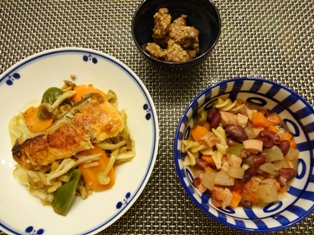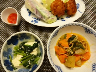 大根と鶏肉の韓国風煮物(おうちでカンタン!韓流ごはん(2)より)エビだんご&生春巻き(ふだん着のおかずより)豆腐と小松菜の煮浸し(塩麹&麹レシピより) * * * * * * * * * * * * *メインの煮物は、レシピではコチュジャンでしたが、それだと我が家には辛すぎるので、ヤンニョムで風味づけしています。このらいの辛さだと息子にもOK。エビだんごは、エスニック料理の中でもとても好きなお料理。タイやベトナム料理のお店に行くと必ず注文します自宅でも作れたらなーと思っていたら、有元葉子さんのレシピでおいしくできるものを見つけ、それ以来、このレシピで作っています。えびと卵白、長ねぎをフードプロセッサーにかけてたねを作り、サンドイッチ用の食パンを5mm角位に切ったものをまぶして揚げています。カリカリの衣と、ジューシーなエビがとても美味生春巻きはエビを使うと素材がかぶるので、鶏の酒蒸しとゆでた春雨、きゅうり、きくらげ、レタスを包みました。サラダのようなあっさりした生春巻きになりました。メインがこってり味だったので、汁物代わりになる薄味の煮浸しを添えました。味付けは塩麹のみ。ほっとする味です。 * * * * * * * * * * * * *豚肉とかぼちゃのコチュジャン炒めチャプチェ揚げ春巻き * * * * * * * * * * * * *本日の男子弁。息子は魚より肉派なので、メインはほぼ鶏→豚→牛のローテーション(^_^;)ついマンネリ化してしまうのが悩みのタネ。ホームベーカリーにお任せのハードブレッドを焼いてみました。エダムチーズの粉末が入ったチーズブレッドです。普段は、ホームベーカリーではこねと一次発酵だけで、成型からは自分でやることが多いので、焼きあがりがどうなるかちょっと心配でした(^_^;)でも、フランスパンコースで7時間かけて焼くこのパンは、なかなかの出来栄え。引きの強い、フランスパン風の食感が出ていたし、皮もパリパリハーブ入りのクリームチーズやたらこバターを塗っていただきました。【送料無料】ホームベーカリーで作るからだにやさしい本格ハードブレッド [ 荻山和也 ]フランスパン用準強力粉 リスドォル★税込1980円以上で送料無料★フランスパン用準強力粉 リスドォル(600g)フランスパンにはこの強力粉!【6,500円以上送料無料】フリコエダムパウダー【チーズ】