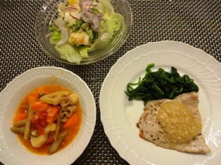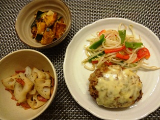 キムチ入りハンバーグ(てんきち母ちゃん家のふつうの日の絶品ごはん(2)より)れんこんのタイム風味きんぴら(有元葉子さんレシピ)かぼちゃとじゃこのクミンシード炒め(毎日がたのしくなる塩麹のおかずより) * * * * * * * * * * * * *ハンバーグのたねに刻んだキムチを加えるだけなのですが、ちょっと味に深みが出て、おいしくなりました♪子供たちにも食べられるよう、レシピよりもキムチの量は控えめにしています。仕上げにスライスチーズをのっけて完成キムチとチーズは鉄板の相性でした付け合わせはやはりキムチと相性のいいもやし。ピーマンと合わせて、塩麹でさっと炒めています。副菜はハーブを使ったおかず2つ。れんこんはベーコンとタイムと一緒に炒めてきんぴらに。塩・こしょうだけで、すっきりと味がまとまります(^_^)かぼちゃはにんにく、じゃこ、クミンシード、カレーパウダーと一緒に炒めています。仕上げは少量の塩麹。我が家の塩麹の消費量はかなりのもの・・・^^; * * * * * * * * * * * * *今日はテニススクールのメンバーの送別ランチ会でした。スクール近くのこのレストランは、こぢんまりしているけれど、味は本格派でお値段はリーズナブル今回はなすとエビのオードブル、鯛のバルサミコソース、桃のコンポート&ジュレを注文。どれもおいしくて、大満足でした普段テニスコートでは、まったく年齢を気にせずお付き合いしているのですが、改めてトシの話になって、皆私よりも年上だったことに衝撃皆さん、マイナス5歳くらいは若く見えます・・・。テニスはアンチエイジングに効果的なのか私も頑張ろう~