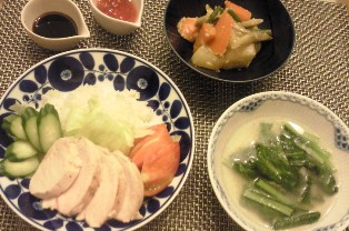 シンガポールチキンライス根菜の塩麹煮(塩麹&麹レシピより)小松菜のスープ * * * * * * * * * * * * *旅行から帰宅した日は、かなりの確率で丼ものになる我が家^^;今日は、シンガポールで食べた海南チキンライスを思い出して作りました。鶏むね肉に塩・こしょうをまぶし、厚手の鍋でゆでて、あくを取り、火を止めてふたをして、煮汁に漬けたまま、じわじわと火を通します。むね肉でもやわらかくジューシーな仕上がり先日、カルディーコーヒーファームで買ったチリソースでいただきました。本来はこの煮汁でごはんを炊くらしいのですが、今回は小松菜のスープに使いました。買い物には行かなかったのですが、冷蔵庫に根菜類が残っていたので、それで煮物を一品。旅行中はどうしてもカロリーオーバーなごちそうが続くので、こういう野菜だけの煮物があるとホッとします。メープラノム スイートチリソース(ポーションタイプ)8p