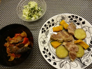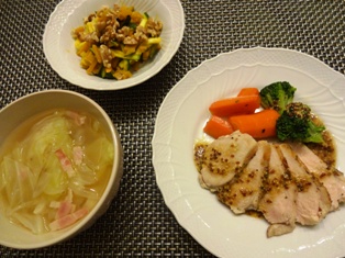 鶏むね肉のマスタードソース(てんきち母ちゃん家のふつうの日の絶品ごはん(2)より)かぼちゃとズッキーニのサラダ ナッツオイルがけ(若林三弥子の蒸しいため完全マスターより)キャベツのカレー風味スープ(たかこさんのしあわせふたりごはんより) * * * * * * * * * * * * *シンガポールでおいしいチキンライスを食べて以来、鶏むね肉料理に凝ってます♪これは鶏むね肉の表面を5分くらい焼いた後、火を止めて、フタをして30分ほど放置して作ります。しっとりやわらかな食感は、むね肉とは思えないほどかぼちゃとズッキーニのサラダもこの夏ハマった味野菜を蒸しいためした後、すし酢とオリーブオイルを回しかけ、ローストしたナッツ類を散らします。かぼちゃを千切りにするのが唯一の手間なくらいで、簡単にできてシンプルな味だけど、とっても気に入っています牛肉といんげんの甘辛炒め小松菜と卵の炒め物れんこんのきんぴらプチトマトの塩麹漬け * * * * * * * * * * * * *昨日の夜、夕食も終わった頃、「明日朝練あるんだって!」と言い出した息子(;_:)息子の学校はグラウンドが狭いため、部活の朝練はローテーション制で、不定期。たいてい前日の夜、子供の携帯宛にメールで連絡が入ります。母としては、登校時間が1時間違うのは、段取り的に大違い!起きたら、日は昇っていたけれど、まだ朝日がうっすらで、電気が必要な明るさでした。まだ暑い日もあるけれど、少しずつ、季節は移っているんだな~(*^_^*)