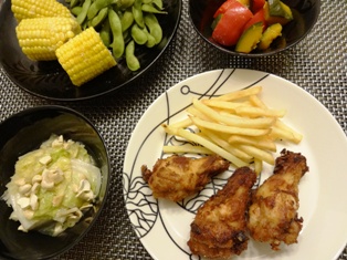 醤油麹のフライドチキン&フライドポテト白菜の蒸しいため ナッツオイルがけ(若林三弥子の蒸しいため完全マスターより)かぼちゃとパプリカのマリネ(つくりおきおかずで朝つめるだけ!弁当(2)より)蒸しいためとうもろこし&枝豆 * * * * * * * * * * * * *醤油麹に漬けておいた手羽元に片栗粉と薄力粉を合わせた粉をまぶして揚げただけです。いろいろ複雑な調味料に漬けこまなくても、しっとりやわらかく、香りがイイ骨付き肉が苦手な子供たちも頑張って食べていました(^^♪白菜の蒸しいためは煮込んだトロトロの白菜とも炒めたシャキシャキの白菜とも違う、独特の食感が気に入っています。白菜の甘みが出るので、特に味付けも必要なく、塩味の他は、ごま油で揚げ炒めしたナッツを油ごとジュッと回しかけるだけでOKなのも嬉しい。かぼちゃとパプリカも厚手のお鍋で蒸しいためしてから、ワインビネガーとオリーブオイルをプラスしてそのまま漬けこんでいます。さっぱりしているので、揚げもののお供に最適とうもろこしと枝豆も蒸しいための調理法でやってみました。普段はお手軽にレンジでチンなのですが、とうもろこしはひげ根を取った後、皮で再度包み直し、少量の水+塩で蒸すとぐーーんと甘さがアップ。今回は枝豆も同じお鍋で蒸しました。レンジ加熱よりも、やはり甘みが増すような気がします。残り少なくなった我が家の塩麹&醤油麹。夏は3日くらいで完成するので、そろそろ次を仕込みます~(*^_^*)【送料無料】若林三弥子の蒸しいため完全マスター [ 若林三弥子 ]