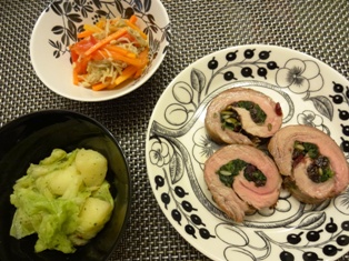 フルーツ入りポークロールにんじんのアラビアータ(若林三弥子の蒸しいため完全マスターより)キャベツとじゃがいもの大葉塩麹オイル和え(毎日がたのしくなる塩麹のおかずより) * * * * * * * * * * * * *豚肩ロース肉を開いて叩き、厚みを均等にしてから、ゆでたほうれん草、パンプキンシード、ドライクランベリー、レーズンを散らして巻きます。表面を焼きつけてから、オーブンへ。フルーツのおかげで、ほのかに甘いジューシーなローストポークになりますストウブのグリルパンを使ったので、フライパンごとオーブンで焼きました。こうすると、オーブンの後片付けがラク~にんじんとえのきを蒸しいためにし、オリーブオイルで炒めたにんにくと赤唐辛子、トマトと合わせています。ぺペロンチーノ風の味で、少し目先の変わったにんじんのおかずになります。男チームには不評でしたが、娘には大ヒット大葉を大量に買ったので、塩麹大葉オイルに。いつもはミキサーでガーッと作るのですが、今回は初めて先日買ったマルチブレンダーを使ってみました。少し時間はかかりますが、洗う部品が少ない分、後片付けがミキサーよりも楽チンでした。【送料無料】貝印〔KAI〕 【送料無料】1台6役♪セレクト100 マルチブレンダー DK5043【D】[調理道具/お菓子作り/調理器具/調理小物/泡だて器/ホイッパー/キッチン用品/DK-5043]【e-netshop】enetshop0924-B1