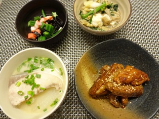 手羽中の甘辛揚げ(てんきち母ちゃんちの毎日ごはんより)春菊と椎茸、長ネギの卵とじ(JUNAさんレシピより)オクラとかにかま、きくらげのごま酢和え(栗原はるみさんレシピより)ぶりと大根の白味噌仕立て(有元葉子さんレシピより) * * * * * * * * * * * * *手羽中を買うと、我が家では8割方これになるくらい、リピート率が高いおかずです。特に夫の大好物。お酒のすすむ味らしいです。(←私は下戸なのでわからない)唐揚げにした手羽中を黒砂糖とバルサミコ酢、お醤油などが入ったコクのあるたれに絡めてあります♪なかなかお料理方法が増えない野菜のひとつが春菊(-_-;)お浸しだと夫も子供も箸が進まないのですが、この卵とじは子供にも食べやすくてなかなかのヒットでした大ぶりに切った大根と切り身ごと贅沢に加えたぶりの汁もの。甘い白味噌との相性もよく、冬らしい味です。息子は期末試験が終わり、早くも冬休み体制(-_-;)息子の学校は、1年の1/3は休みではなかろうか・・・と思うほど、休みが長い(一応、終業式はまだですが、試験終了から終業式までは休み。)というわけで、ふたりお昼ごはん。サーモンのお刺身をコチュジャン入りのたれで漬けにしたものと、角切りの長芋、オクラ、海苔を合わせてどんぶりに。少量のサーモンでも満足感があります。小鉢はピーマンとにんじんをピーナッツの粉末で和えたごま和え風の一品。ピーナッツはマルチブレンダーで粉末にしました。人気の白いマルチブレンダー! 専用カップ付特価♪今なら専用容器&オリジナルDVDが付いてくる!貝印 マルチブレンダー [DK-5043]【半額以下】