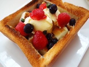日曜日の朝は、ゆっくり朝ごはんが食べられるので、食パンで作ったケースにアイスやフルーツを盛り込んだメイプルトーストに。先週出かけたお店で出てきたハニートーストがヒントです。こちらがそのハデハデハニートースト。花火まで刺さってます・・・^^;