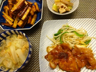 豚肉の生姜焼き もやし&ピーマンソテーれんこんとセロリのきんぴら黒糖大学芋白菜と干しだらのスープ * * * * * * * * * * * * *