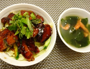 豚バラ丼わかめスープ * * * * * * * * * * * * *見るからに夫が忘年会の日の献立です^^;厚切りにした豚バラ肉をカリカリになるまで焼きつけ、出てきた脂を拭きとってから、甘辛いたれを絡めます。ゆでたキャベツと千切りのきゅうりと合わせて丼に。普段お肉を食べない娘も、こういう味付けだと多少は食べてくれます。スープはソウルで買ってきたエビ入り乾燥ワカメをあさりダシダを溶いたスープに加えたもの。けっこう大ぶりのエビが入っていて、便利でした♪*韓国食品*貝 ダシダ(あさりダシダ)300g