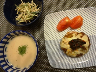 キムチ入りハンバーグ(てんきち母ちゃん家のふつうの日の絶品ごはん(2)より)ごぼうときゅうりのサラダにんにく風味のかぶのクリームスープ * * * * * * * * * * * * *合びき肉400グラムに対して、刻んだキムチがたっぷり200g入っています♪汁気を切って使うので、あまり辛さは感じず、旨みがアップスープは玉ねぎとにんにく、ベーコンを炒めてから、スライスしたかぶを加え、コンソメスープで煮て、ミキサーにかけて牛乳を加えて温めなおして出来上がり。あっさりした中にもパンチがきいていて、味がぼやけがちなかぶがキリッとしまります。