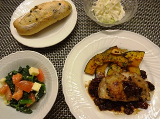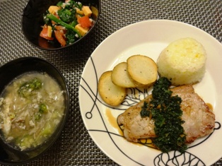 ポークソテー パセリソース(てんきち母ちゃんちの毎日ごはん1 より)じゃがいもソテー&サフランライスほうれん草とチェダーチーズ、トマトの塩麹和えごぼうとブロッコリーのスープ(カフェオレボウルでごちそうスープ より) * * * * * * * * * * * * *