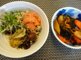 本日のお昼ごはん。おうちでカンタン!韓流ごはん(2)のレシピです。五穀米に牡蠣、むき栗、なつめ、ぎんなんなどを加えて炊き込み、食べるときに明太子とブロッコリースプラウトを添えています。薄味なので、明太子の辛味がほどよいアクセントです。煮物は昨日の女子ごはんの残りです…^^;これから毎日お昼ごはんに悩む日々が始まる~