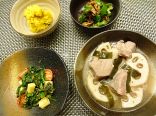 塩麹豚とれんこんの煮込み(「ル・クルーゼ」で、おいしい和食より)春菊とチーズの醤油麹和え(てんきち母ちゃんブログより)かぼちゃとじゃがいもの味噌マヨ和え(つくりおきおかずで朝つめるだけ!弁当(2)ピーマンとツナの塩昆布炒め(てんきち母ちゃんちの毎日ごはん3より) * * * * * * * * * * * * *3日ほど塩麹をまぶして寝かせておいた豚肩ロース肉の塊を、大ぶりに切ったれんこんと昆布と合わせて煮込んでいます。素材から味が出るので、塩で味を調える程度でOK。ほんのり甘いれんこんも美味です。春菊は新しい食べ方でした!チーズのおかげで、苦味も和らぎ、食べやすかったです。かぼちゃとじゃがいもの組み合わせって、聞いただけでのどが詰まりそうな感じですが、食べてみてびっくり。甘くて、意外な美味しさでした。お砂糖も入っているのですが、お味噌がキリリと味を締めていて、和洋折衷な感じでどんなおかずとも合いそうでした。