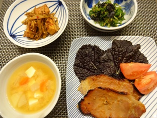 豚肉の味噌漬け焼きごぼうと厚揚げのきんぴら(YOMEの基本のおかずアレンジおかずより)水菜と韓国のりのナムルお豆腐と大根、にんじんの味噌汁* * * * * * * * * * * * * * 豚肉は厚切りではなく、生姜焼き用のお肉を使用。少し漬け込むだけで、しっかりお味噌の味がつき、お手軽です。我が家では人気の薄い水菜夫も子供もあの歯に挟まりそうな食感がダメらしい。しかし、夫の実家から自家栽培の水菜をたっぷりもらってきたので、頑張って使い切りました♪茹でてごま油やすりごまでナムル風の味付けにして、さらに夫も子供も好きな味付き韓国のりもプラスして、少しでも食べやすく・・・ごぼうと厚揚げのきんぴらは豆板醤を加えたややピリ辛。我が家の子供たちは厚揚げやがんもが好きなので、こちらは大人気のおかずです