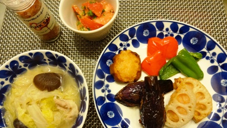 れんこんのエビはさみ揚げなすのひき肉はさみ揚げエビトーストピーマン素揚げトマトのナムル(おうちでカンタン!韓流ごはん(2)より)白菜と干し椎茸、春雨のスープ* * * * * * * * * * * * * *