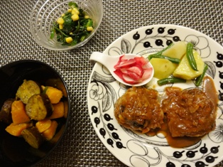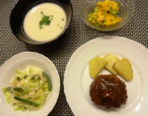 基本のハンバーグ蒸しいためコールスローかぼちゃサラダかぶと甘酒のポタージュ* * * * * * * * * * * * * * 新学期が始まって1週間。土曜日も息子はお弁当もちで午前中授業→午後はめいっぱい部活で帰宅は7時過ぎ。一週間お疲れさま~!ということで、大好物のハンバーグにしました。画像は私の分なので、控えめですが、息子のお皿はこのハンバーグが2つに、じゃがいもも山盛りです(^^;)このコールスローは厚手のお鍋で蒸しいためにしているので、生のキャベツを塩もみして作りよりも甘味が出て、やわらかな食感。葉物大好き娘が大喜びして食べていました。味付けはすし酢と少量のマヨネーズ&粒マスタードです。かぶのポタージュはかぶが足りなかったので、大根もプラス。かぶも大根も夫実家の自家菜園作。これでほぼ使いきり