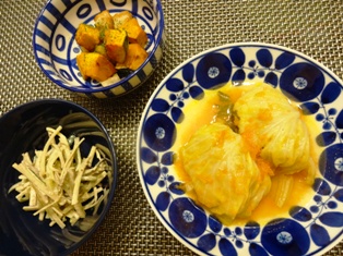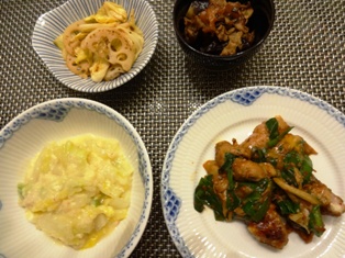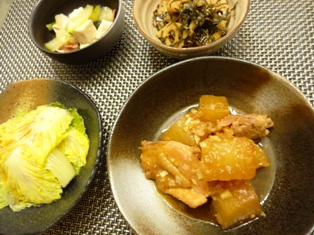 大根と鶏肉のコチュジャン煮(おうちでカンタン!韓流ごはん(2)より)白菜の蒸しいため カシューナッツ&ごま油がけれんこんと糸昆布のきんぴら(私の贈りものより)高野豆腐とセロリの煮物(てんきち母ちゃんレシピより)* * * * * * * * * * * * * * 夫の実家の自家菜園で採れた白菜や大根を使った献立です♪お正月にかなり野菜不足だったので、帰宅してからは野菜が無性に食べたくなります(^^ゞこういう献立はほぼベジタリアン(?)の娘が大好き。
