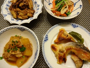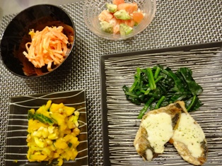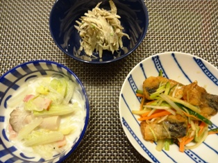 さばのカレー南蛮漬け白菜とエリンギのクリーム煮ごぼうのごまマヨサラダ* * * * * * * * * * * * * * 豚肉の竜田揚げほうれん草と切干大根入り卵焼きにんじんとピーマンのきんぴら