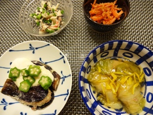 白菜と豚バラ肉の煮物(栗原はるみさんレシピより)なすのはさみ揚げ 大和芋のとろろがけ( 〃 )大根とかにかま、ひじきのごまマヨ和えにんじんと明太子のきんぴら* * * * * * * * * * * * * * 夫実家から持ち帰った白菜3株もこれで最後!白菜好きの娘に感謝です~なすのはさみあげにかけた大和芋も夫実家作。やはり長芋よりもねっとりと味が濃く、とろろにすると抜群に美味しい♪