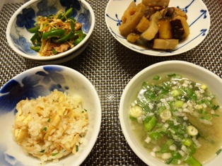 なめたけとツナ、油揚げの炊き込みご飯鶏肉とさつまいも、レンコンの味噌煮根三つ葉とピーマン、えのきのラー油ポン酢炒めお味噌汁* * * * * * * * * * * * * * 今日は夫が飲み会だったので、小さなおかずを並べた簡単晩ごはんでした。本日のひとりお昼ごはん。細めのスパゲッティに大根おろし、なめたけ、三つ葉をのせ、めんつゆをかけた和風パスタです。チキンのバーニャカウダソース焼きゆでブロッコリー&カリフラワーにんじんとさつま揚げのきんぴらキャベツのゆかり和え* * * * * * * * * * * * * * 今日のお弁当のメインおかずは、昨夜の余ったバーニャカウダソースに鶏肉を漬け込んでおき、朝焼いたもの。簡単にできて、お肉もやわらかく仕上がりました♪