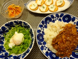 ひき肉のカレー水菜と温泉卵のサラダにんじんとツナのサラダ(もう一度、ごちそうさまがききたくて。より)ブルサンチーズのカナッペ* * * * * * * * * * * * * * 帰省先の名古屋から帰宅した日の献立です。買い物に出たくなかったので、うちにあるもので作りました(^^ゞ冷凍してあった豚こま&牛こま肉をフープロでミンチにし、煮込まなくて済むひき肉カレーにしました。あとは夫の実家の家庭菜園で採れた新鮮な水菜と自家製温泉卵でサラダに、にんじんとツナ缶、玉ねぎを合わせたサラダ。今回は帰省期間が長かったので、洗濯物が山積み・・・。明日から日常が戻ります~。【50%OFF!半額セール!】忙しい朝にうってつけ!一度に5個の温泉たまごが作れます!チョチ モーニング温泉たまご(単品)カクセー/チョチ モーニング温泉たまご (温泉たまご器・温泉たまごメーカー・温泉卵)ビビンバやサラダに添える温泉卵が簡単にできるので重宝しています♪