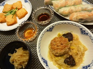 肉団子と白菜、春雨の煮込み生春巻きエビトースト大根のナムル* * * * * * * * * * * * * * 今日は中華風、韓国風、タイ風、ベトナム風・・・とアジアンな食卓です(^^;)エビトーストはお手頃なバナメイエビをフープロですり身にし、卵白、塩、片栗粉、お酒で調味したものをサンドイッチ用のパンにのせて揚げています。家族みんなが好きな味です♪たれは市販のスイートチリソースとポン酢。