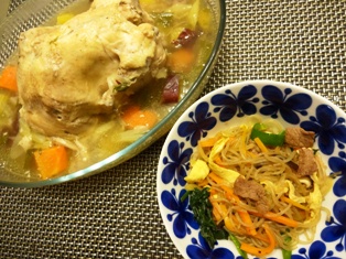 参鶏湯チャプチェ* * * * * * * * * * * * * * 今日は夫が夕食いらずの日だったので、圧力鍋で簡単にできる参鶏湯に。隣市のスーパーにはクリスマス以外でも常に丸鶏が置いてあるので、立ち寄る機会があるときには、よく買って帰ります邪道かもしれませんが、我が家ではスープににんじんやセロリ、さつまいもなど、野菜をいろいろプラスしていただきます♪お腹にはもち米のほか、甘栗、ナツメ、にんじん、生姜などが入っています。あとは野菜がいっぱい取れるように韓国春雨を使ったチャプチェ(雑菜)にしました。本日のお弁当。豚肉でチーズを巻いたピカタと、ニンジンの柚子マヨサラダ、ブロッコリーのグラタン風。まだお弁当作りの時間帯は日の出前で、薄暗くて寒い・・・