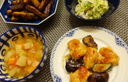 鶏むね肉のスイートチリ照り焼き(てんきち母ちゃんブログより)白菜とツナのコールスロー黒糖大学芋野菜スープ * * * * * * * * * * * * *