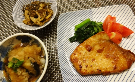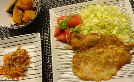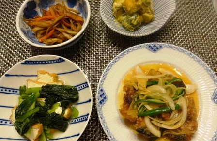 さばの南蛮漬け(つくりおきおかずで朝つめるだけ!弁当(2)[ 小田真規子 ]より)かぼちゃと椎茸のごまマヨ和え( 〃 )小松菜と厚揚げの揚げびたしごぼうとさつまあげのきんぴら(YOMEの基本のおかずアレンジおかず[ 大井純子 ]より) * * * * * * * * * * * * *