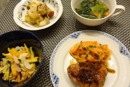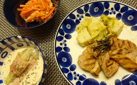 豚ヒレ肉のハーブマリネ焼き(ようこそ、私のキッチンへ[有元葉子]より)春キャベツとじゃがいもの塩麹大葉オイル和え(毎日がたのしくなる塩麹のおかず[ おのみさ ]より)ベーコン巻なすのクリーム煮(おいしいね電子レンジ[ 栗原はるみ ]より)にんじんとえのきの蒸しいため トマト和え(若林三弥子の蒸しいため完全マスターより) * * * * * * * * * * * * *豚ヒレ肉をオリーブオイルやタイム、ローズマリー、ローリエ、塩などを合わせたマリネ液に漬け込んでおき、ソテーしています。シンプルなお料理ですが、ハーブの香りがよくて、夫の大好物にんじんは蒸しいためにすると、びっくりするくらい甘味が出るので、塩で軽く味を調えるくらいでOK。えのきの食感とトマトの酸味&甘味でするすると食べられます。こちらは娘の大好物