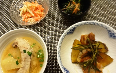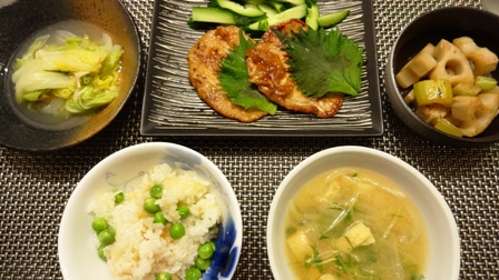 豚肉の梅照り焼き白菜とホタテの煮物れんこんとセロリのきんぴら水なと油揚げの味噌汁豆ごはん * * * * * * * * * * * * *