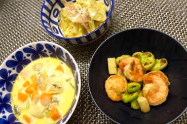 えびとそら豆の塩炒めキャベツと豚バラ肉の重ね蒸し 粒マスタードソースクラムチャウダー * * * * * * * * * * * * *