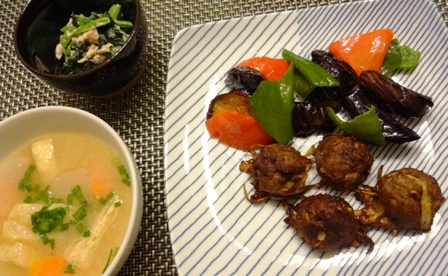 あじのさつま揚げ&なすとピーマンの素揚げ小松菜とツナのサラダ根菜と油揚げの味噌汁 * * * * * * * * * * * * *