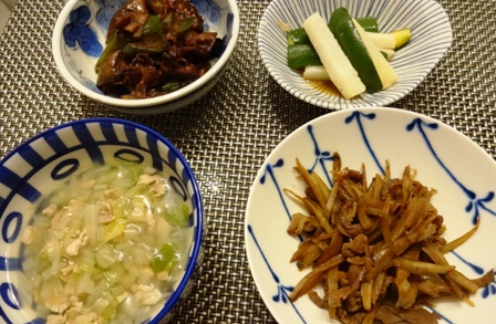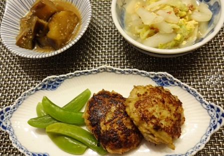 ごぼう入り鶏つくね&スナップえんどう(YOMEの基本のおかずアレンジおかず[ 大井純子 ]より)なすの味噌煮(栗原はるみさんレシピより)白菜のおかか卵とじ(ごちそうさまが、ききたくて。[ 栗原はるみ ]より) * * * * * * * * * * * * *