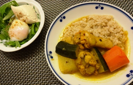 スープカレー(圧力鍋のもっと絶品おかず[枝元なほみ ]より)温泉卵とおぼろ豆腐入り水菜サラダ * * * * * * * * * * * * *夫飲み会につき、簡単2品で晩ごはん。ごろごろの野菜がたっぷり入ったチキンのスープカレーです。玄米ごはんがよく合います♪パン教室の先生からいただいた手作りのいちごジャム。なんと贅沢にもあまおうで作ってあります。甘さ控えめで本当に美味しかった~あっという間になくなりました・・・^^;