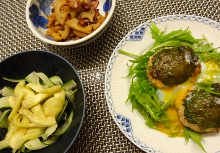 しそ入り豆腐ハンバーグ(つくりおきおかずで朝つめるだけ!弁当(2)より)なすときゅうりの冷製(たかこさんのしあわせふたりごはんより)れんこんとベーコンのきんぴら(ごちそうさまが、ききたくて。より) * * * * * * * * * * * * *