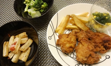 フライドチキン&フライドポテトほうれん草とコーンのサラダれんこんとベーコンのタイム風味きんぴらブロッコリーのごま和え * * * * * * * * * * * * *