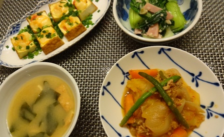 キムチ入りそぼろ肉じゃが(てんきち母ちゃんレシピより)厚揚げの明太子チーズ焼き( 〃 )青梗菜とハムの塩麹炒め厚揚げの中身とわかめの味噌汁 * * * * * * * * * * * * *夫飲み会につき、お手軽晩ごはん♪冷蔵庫にあるもので作りました・・・な感じが漂ってます~。