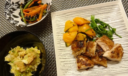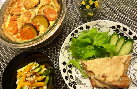 チキンの明太マヨソテー(てんきち母ちゃんレシピより)さつまいもとにんじんのグラッセのキッシュ(塩スイーツ [ 熊谷 真由美 ]より)ほうれん草とコーンのはちみつレモン和えズッキーニとかぼちゃのナッツオイルがけ(若林三弥子の蒸しいため 野菜調理のスーパーテクニックより) * * * * * * * * * * * * *キッシュはお菓子の本に載っていたレシピ。さつまいもとにんじんをグラッセにしてから、キッシュ生地の上に卵液と一緒に入れて焼きます。お菓子としても、食事用としてもOKな感じのキッシュでした♪【送料無料】【バーゲン本】 塩スイーツ [ 熊谷 真由美 ]