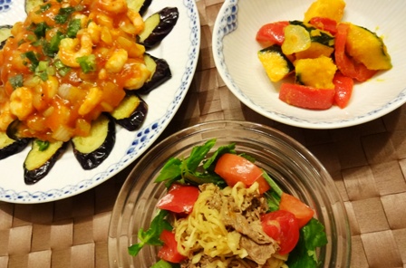 なすのエビチリソース切干大根と牛しゃぶのサラダかぼちゃとパプリカの蒸し煮 * * * * * * * * * * * * *コストコで買った冷凍むきえびを使ったチリソースを、素揚げしたなすにかけています。きょうの料理で紹介されていて、結婚前から作っていたお気に入りのレシピ。コストコの冷凍むきえびは背わたもとってあるので、下ごしらえいらずむきえびにしては大ぶりで、味もイイシーフードガあまり得意ではない息子もこのエビは「ぷりぷりしてておいしいね!」と言ってくれます♪黒米入りの全粒粉パンと甘納豆入りの丸パン。両方とも藤田千秋さんのレシピです。黒米のパンは見た目黒っぽくてグロテスクですが、風味があって、しみじみおいしい。でも家族は甘~い豆パンのほうが好みのようで・・・ほとんど私が食べます(^_^;)