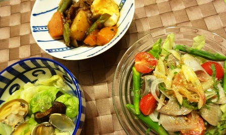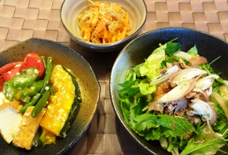 牛しゃぶサラダ夏野菜の塩麹おでん(塩麹&麹レシピより)にんじんとしらたきのツナ卵とじ(てんきち母ちゃんレシピより) * * * * * * * * * * * * *