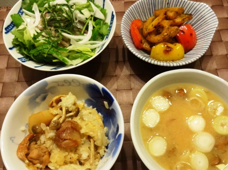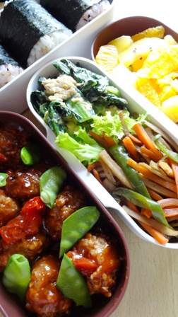 肉団子のプチトマト甘酢和え&絹さや小松菜と卵のマヨ炒め牛ごぼうきんぴらオレンジとゴールドキウィおにぎり * * * * * * * * * * * * *今日は娘の小学校最後の運動会。それなのに、夫が参観できなかったので、お弁当は娘と二人分です(*_*)娘の好きなものばかりを詰めました♪何事にもマイペースな娘。お弁当も超スローペースながら完食肝心の競技ですが、まだ競争ということの意味はわかっていないながらも、一応言われたことはやらなくちゃね・・・という感じは出ていて、かすかな成長を感じました(*´∀`*)今年は応援団にも参加し、チアガールもどきのことも^^;踊ってはいませんでしたが、嫌がらずにポンポンを持っていただけでもよしとしますお天気に恵まれたものの、一日屋外ですごしてぐったり。やる気のない夕食となりました三日ほど前から仕込んであった塩豚をローリエやクローブ、タイム、白ワインと一緒にストウブのお鍋でじわじわと加熱してゆで豚にし、野菜を添え、塩麹&練りゴマ、はちみつなどを合わせたたれでいただきました。スープはあり合わせの野菜にお弁当の残りのきんぴら、トックを加えた国籍不明のスープ(^_^;)
