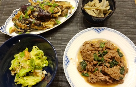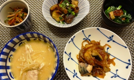 さばと新玉ねぎの煮物なすと豚バラ肉の梅ポン酢炒めごぼうとにんじん、ピーマンのきんぴらにらとちくわの塩麹炒めバターとおろしにんにく入りもやしと豚肉の味噌汁 * * * * * * * * * * * * *