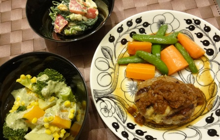 チーズ入りハンバーグにんじんとスナップエンドウのグラッセ温野菜サラダ&バジルドレッシングほうれん草とトマトのおかかマヨ和え(てんきち母ちゃん家のふつうの日の絶品ごはん(2)より) * * * * * * * * * * * * *チーズは先日コストコで買ったお友達から分けてもらったもの。チェダーチーズとモッツァレラチーズがマーブルになっていますのびがよくて、コクもあって、ハンバーグとの相性もバッチリバジルドレッシングは市販のフォションのもの。おいしそう!と思ってジャケ買いならぬ、パッケージ買いをしたのですが、我が家の好みにはイマイチ合わず・・・(-_-;)豚肉のコチュジャン炒めゆでブロッコリーじゃがいもの塩麹きんぴらチャプチェ * * * * * * * * * * * * *