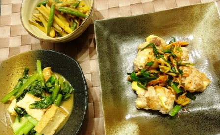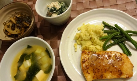 かじきまぐろの粒マスタードソテー&さつまいものマッシュポテト、いんげんソテー(もう一度、ごちそうさまが、ききたくて。/栗原はるみより)れんこんと糸昆布のしそきんぴら(私の贈りもの [ 栗原はるみ ]より)ほうれん草とエリンギの白和えお豆腐とわかめの味噌汁 * * * * * * * * * * * * *