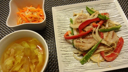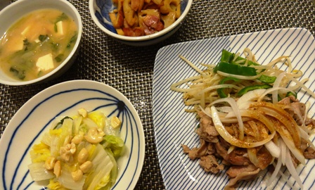 豚肉のジンジャードレッシングがけ(てんきち母ちゃんレシピより)白菜の蒸しいため カシューナッツ&ごま油がけれんこんとちくわのきんぴらお豆腐と三つ葉、みょうがの味噌汁 * * * * * * * * * * * * *おろし生姜ではなく、ジンジャーパウダーを使ったドレッシングをかけた生姜焼きです。息子用には新玉ねぎはナシ。娘は玉ねぎ好きなので、大人と同じ量だけのせました♪