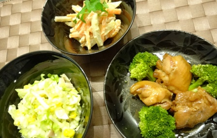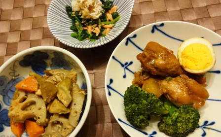 鶏手羽元のお酢煮&ブロッコリー、ゆで卵根菜とツナのきんぴらほうれん草と鮭のおろし和え * * * * * * * * * * * * *