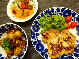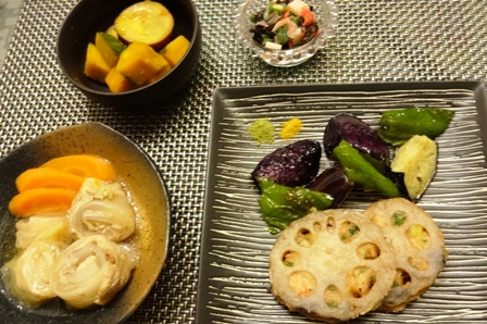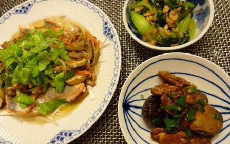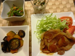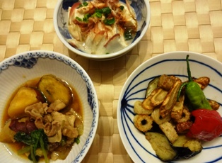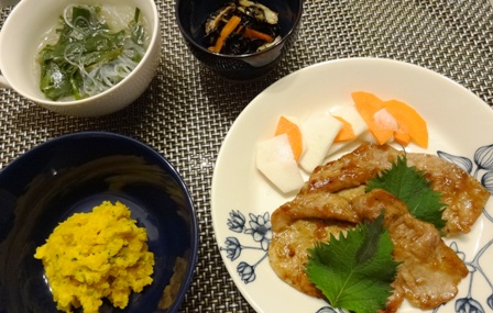 豚バラ肉とさつまいもの甘煮野菜とちくわの揚げ浸しみょうがとおかかの冷ややっこ * * * * * * * * * * * * *豚肉と野菜の塩麹炒めほうれん草と明太子巻き卵焼きごぼうのサラダ * * * * * * * * * * * * *