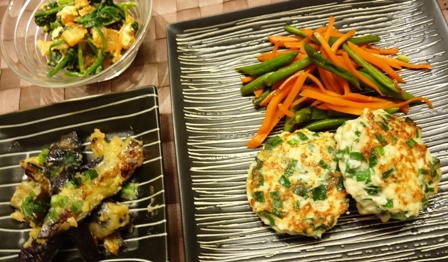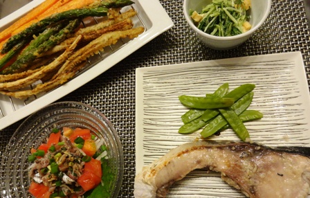 いわしのたたきサラダぶりの塩麹焼き野菜のスティックてんぷら3種(栗原はるみさんレシピより)水菜と油揚げのしそマヨ和え * * * * * * * * * * * * *お刺身用のいわしをかったので、生姜・みょうが・しそと合わせてたたきにしました。千切りの大根やトマトと合わせて、サラダ仕立てに。子どもたちにも大好評♪特に娘がおかわりしたので、私の分はほとんどナシ・・・(;_:)野菜のてんぷらは、にんじんがびっくりするほど甘くなりますうちでは毎回にんじんは2本分揚げますが、あっという間になくなる人気者。これは天つゆではなく、抹茶塩やカレー塩でいただくのがオススメ水菜はマヨ&すし酢にしその千切りを加えたもので和えました。ごぼう入りつくねいんげんと絹さやのごま和えかにかまと大葉入り卵焼きキャベツと小松菜の煮浸し * * * * * * * * * * * * *