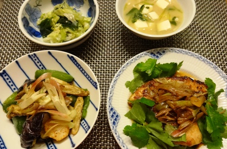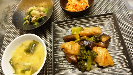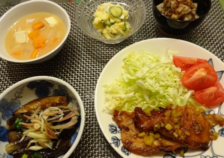 鶏肉となす、ブロッコリーの酢炒め長芋と小松菜の豚肉あんかけにんじんの塩麹サラダキャベツとわかめ、じゃがいもの味噌汁 * * * * * * * * * * * * *