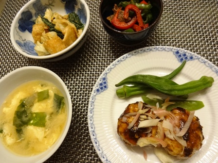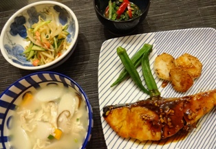 ぶりの香味煮 長芋&オクラもやしときゅうり、カニかまのごま酢和え空芯菜と赤ピーマンのオイスター炒めトックスープ * * * * * * * * * * * * *