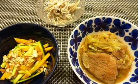 塩豚とキャベツ、白いんげん豆の煮込みかぼちゃとズッキーニのナッツオイルがけごぼうのごまマヨ和え * * * * * * * * * * * * *